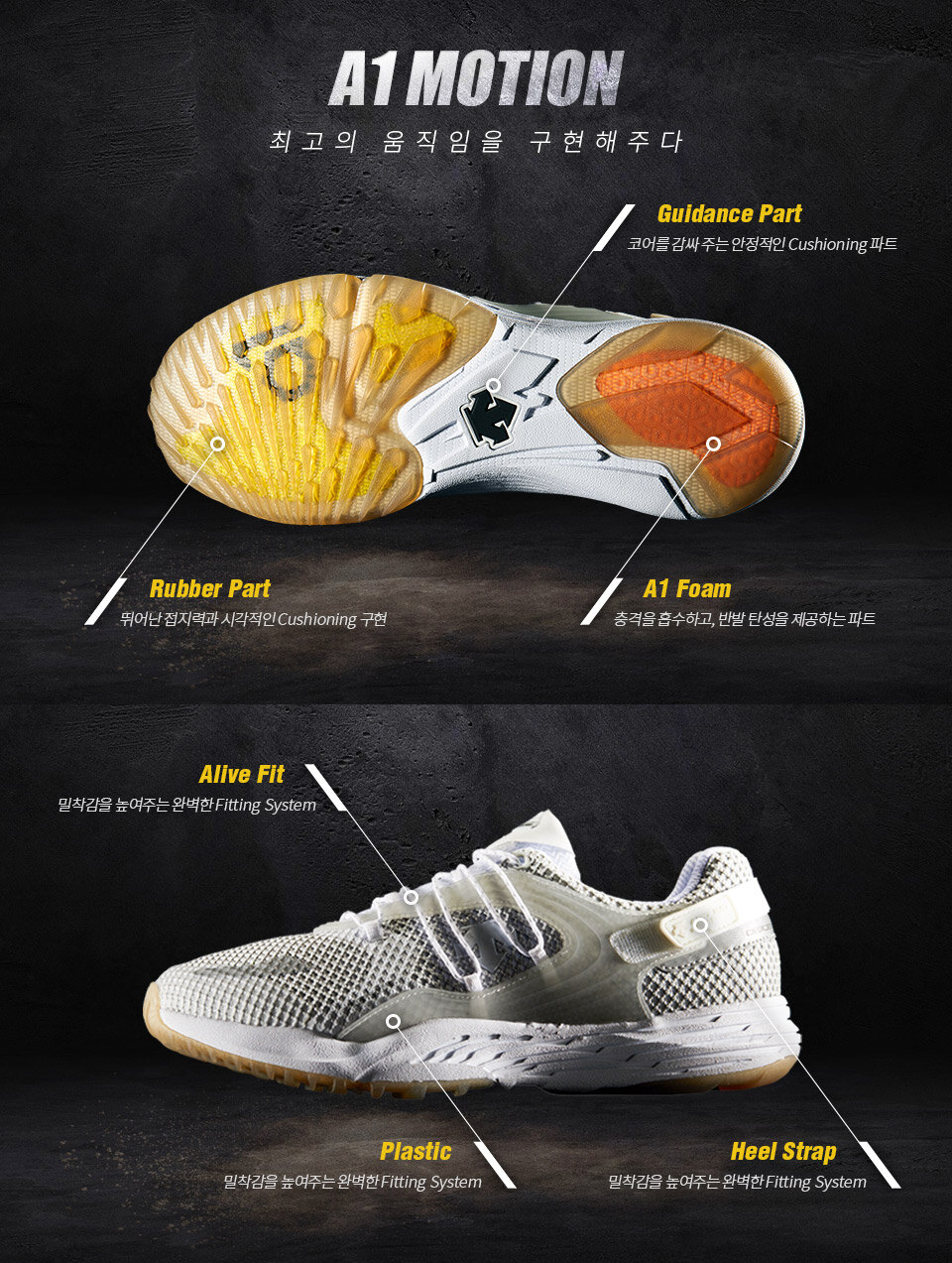 ▶ 미드솔에 A1폼을 적용하여 기존 제품 대비 20% 가량 향상된 탄성 및 쿠셔닝을 선사합니다.