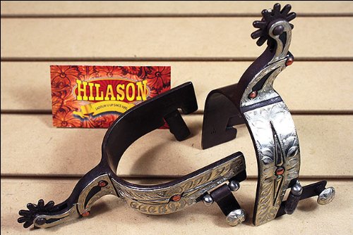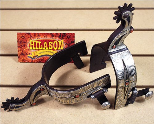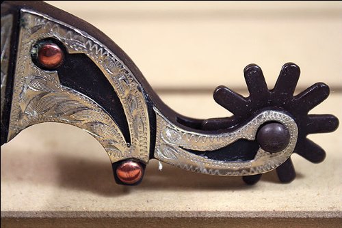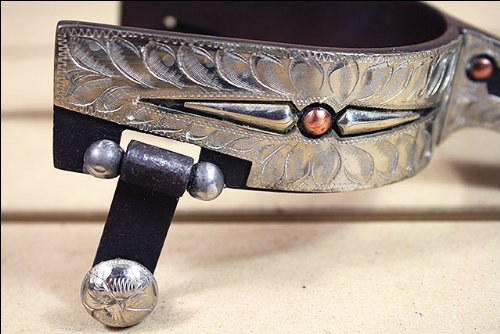 Studio : American Heritage Equine Publisher : American Heritage Equine Binding : Misc. Product Description Silver Trim and Copper Studs Men's Show SpurThis beautifully designed men's spur is antique brown with Engraved German silver trim and copper studs. It comes with 1 1/4" band, 2 1/2" shank, chap guard and 10pt antique brown rowels. This unique design really makes this spur stand out. It's functional and stylish and any cowboy would be proud to wear it.One Size 0