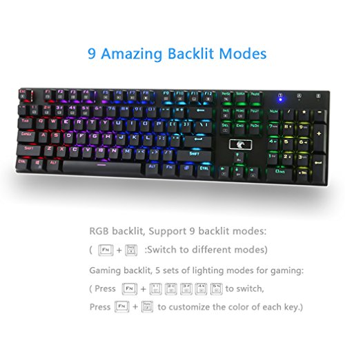 9 RGB backlight modes, Press FN+INS to cycle set the mode. 5 customized backlight modes. Press FN+1-5 to choose the backlight model; Press FN+HOME to customize the color of each key.