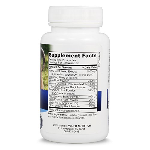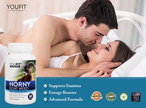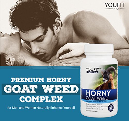 Horny Goat Weed 1000mg Supplement Supports ENERGY and STAMINA for Performance and Focus without the Jitters for MEN and WOMEN. The Blend was developed by a team of experts for Quality so you can Enjoy what matters. The product Ingredients are: Horny Goat Weed Extract 1000mg, Maca Root Powder, Mucuna Pruriens, Tonkat Ali Root powder, L-arginine, Polypodium Vulgare Root powder, Saw Palmetto Berry powder, Muira Puama and Panex Ginseng Root powder. The supplement is a Premium blend so you can have the support you are looking for without other alternatives.Feature