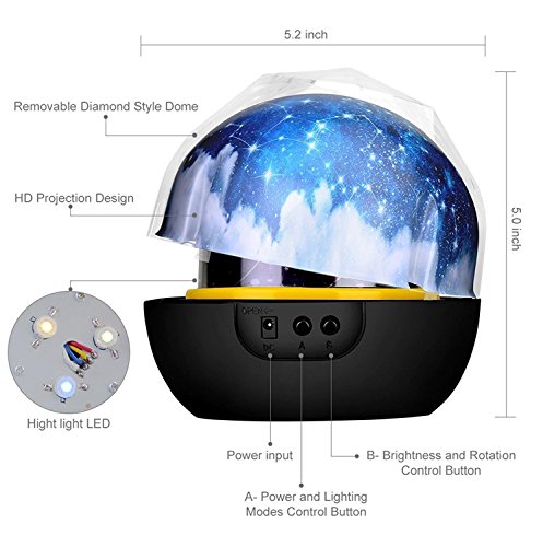 - Dimmable Light -- 3 types of light 5% 50% 100% light strength protect the eye and choose suitable light for sleeping. Press B button to switch, long press it about 3 seconds to rotate the projection image.