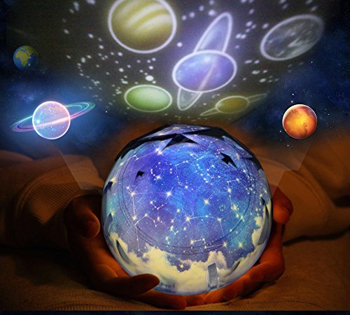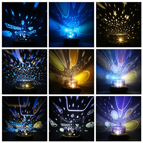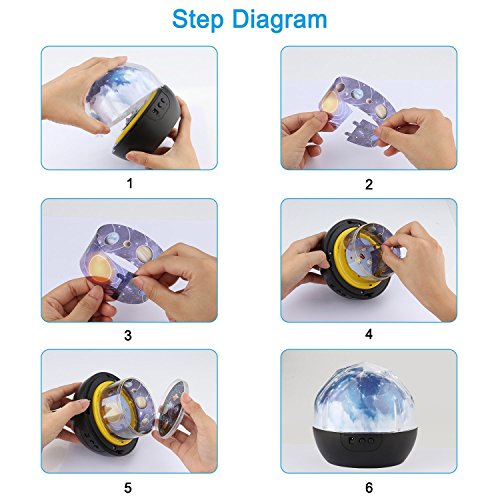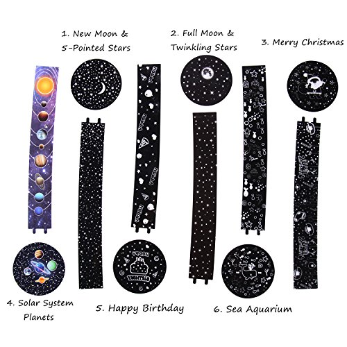 - 6 Replaceable Projection Films -- Solar System Universe, Starry Star & New Moon, Twinkling Star & Full Moon, Aquarium, Christmas and Happy Birthday. A magic world displayed on your roof.