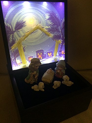 • A touching portrayal of that most holy night, the backdrop lights up with LED bulbs, plays "Silent Night," pieces are displayed and stored in a beautiful wooden box