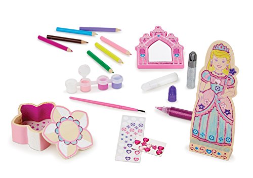 Studio : Melissa And Doug Publisher : Melissa And Doug Binding : Toy Product Description With this engaging set, kids can decorate 3 princess-themed crafts! The pretty wooden princess doll features a different design on each side; the pink castle mirror features kid-safe shatterproof glass; and the flower box is a great spot for storing royal treasures. Also includes 15 gem stickers, 38 foil stickers, 7 colored pencils, 2 glitter glues, white glue, 4 pots of paint, and a paintbrush to make these crafts as unique as your own style! 0