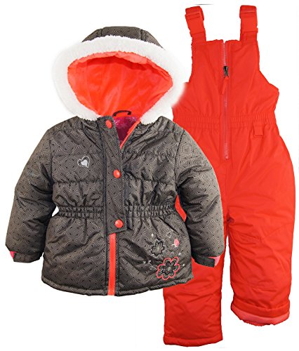 Two-piece set includes snowsuit overalls with smocked waistband hooded jacket in tonal embossed print with embroidered flower at hem
