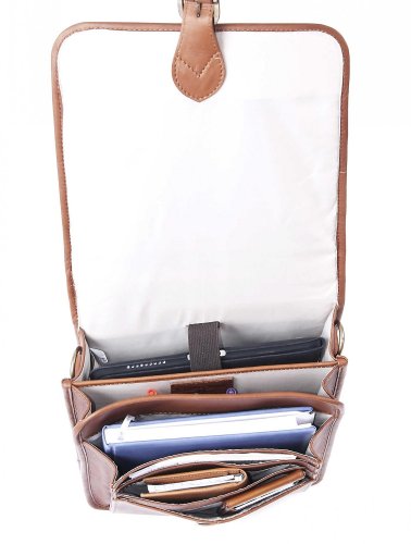 -. Feature : Will hold most small computers i-pad, notebook in padded area / Has four separate file compartments / Elastic straps for pens/pencils. Rear has roomy zippered compartment. / Fully lined / All leather adjustable removable shoulder strap