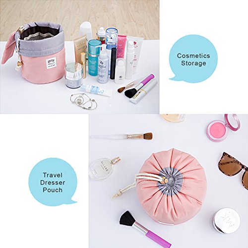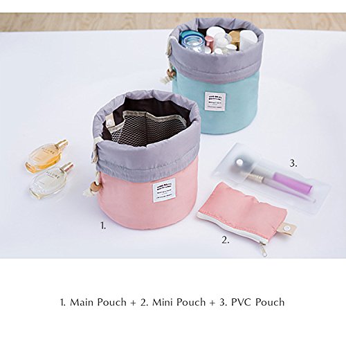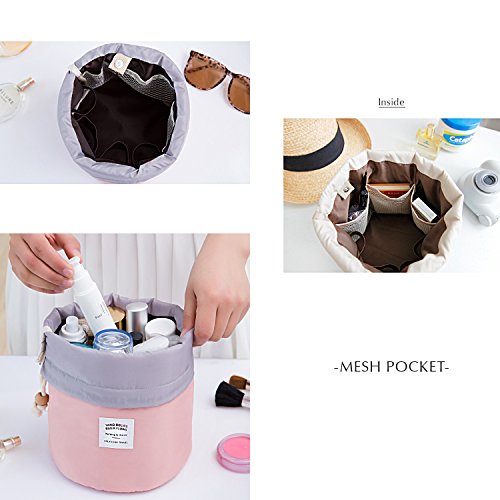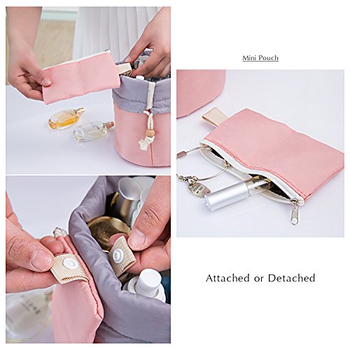 - CONSTRUCT: The design of cylindrical three-dimensional construct make it easy to stand on the desktop. And this makeup bag comes with mini accommodation package (it can be placed jewelry, etc.), with PVC transparent pocket (it can be used to place makeup brush in order to avoid dirt and cosmetic contamination bag)