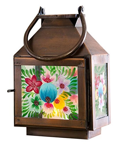 -. Feature : Square metal lantern with hand-painted Floral panels / Antique copper-colored metal frame / Hand-painted transparent panels / Works best with flameless LED candles (sold separately) / Indoor use only