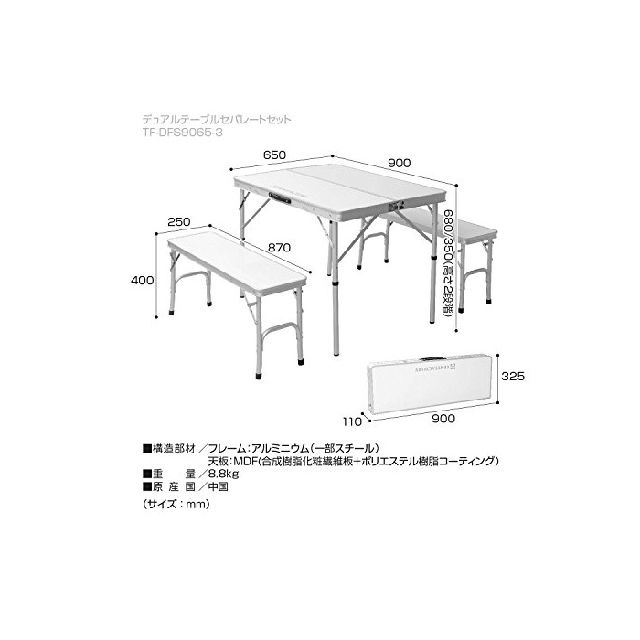 원본상품명: テントファクトリ? テ?ブルセット デュアルセパレ?ト ホワイト テ?ブル(90×65×68(35)cm) チェア(87×25×40cm)×2脚 TF-DFS9065-3-WH