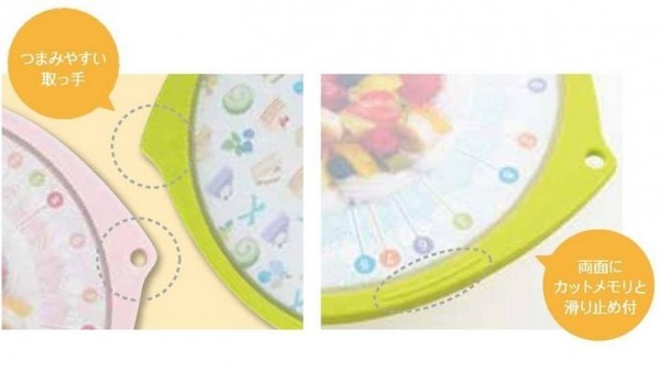 | つまみやすい取っ手や、両面にカットメモリ、滑り止めが付いています。 |