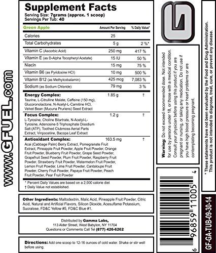 -. Binding : Health and Beauty -. Brand : GAMMA LABS -. Label : GAMMA LABS -. Manufacturer : GAMMA LABS -. ProductGroup : Health and Beauty -. ProductTypeName : HEALTH_PERSONAL_CARE -. Publisher : GAMMA LABS -. Studio : GAMMA LABS -. Title : G Fuel Green Apple - Elite Energy and Endurance Formula