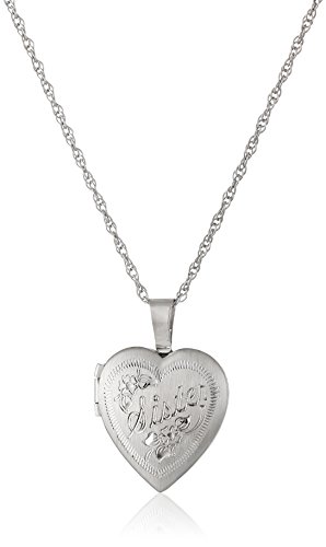Sterling silver necklace featuring heart locket engraved with flowers and cursive "Sister" text