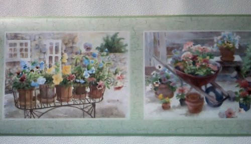 -. Feature : 15 Foot Long Spools - Prepasted Wallpaper Border / 7 Inches Wide - Pattern JB970B / Watercolor Gardening Wallpaper Border / Flowers Wallpaper Border / Flowerpots, Wheelbarrows, Flowers, Garden Tools