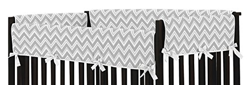 -. Feature : Features an exclusive gray and white zig zag P.R.Int fabric with coordinating white ties. / 100% Cotton Fabrics / Single Front Rail Guard Measures 52 in. x 18 in. / Attaches easily with secure ties. Easy machine washing and drying. / This design has matching accessories such as window treatments, hampers, shower curtains, memory photo boards, body pillow cases and decorative pillows.