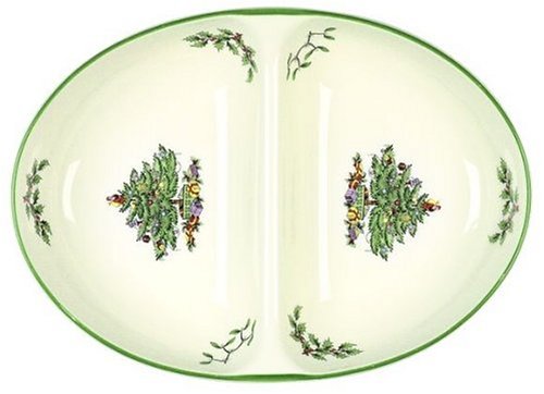 Amazon.com Celebrate the holidays with this attractive divided dish from Spode's beloved Christmas Tree pattern. Filled with side dishes, from potatoes and yams to crudite or snacks, this versatile piece is a cheerful addition to the table. A traditional favorite since 1938, the pattern decorates tables with the classic signature design. The evergreen full of delightful ornaments and gifts, with accents of mistletoe, holly boughs, and a green rim on an ivory background, creates warm memories every season. Made of quality high-quality porcelain, this 11-1/2 by 8-1/2 inch dish coordinates with the merry motifs in the extensive line of dinnerware, stemware, and serveware. Safe in the dishwasher, freezer, and microwave, this British import comes gift-boxed for the perfect present. --Roberta Cruger 0