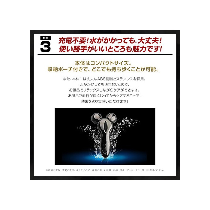 【쓰기에 편리 함이 최고도 매력!】콤팩트 사이즈이기 때문에,어디에서라도 가지고 걷는 일이 가능합니다.또한본체에는 튼튼한 ABS수지와 스테인레스를 채용.물이 걸려도 망가지지 않는다※것이 욕실에서 릴랙스 하면서 케어로 옵니다.욕실로 혈행이 좋아지고 나서 케어 하는 것으로,한층 더 노폐물이 흘러 쉬워지기 때문에 효과가 보다 실감 하실 수 있는. ※고장이나 변색,변질 원인 이되기 때문에, 욕조 중,입욕 제,비누,온천,풀,사우나등은 피해주세요.