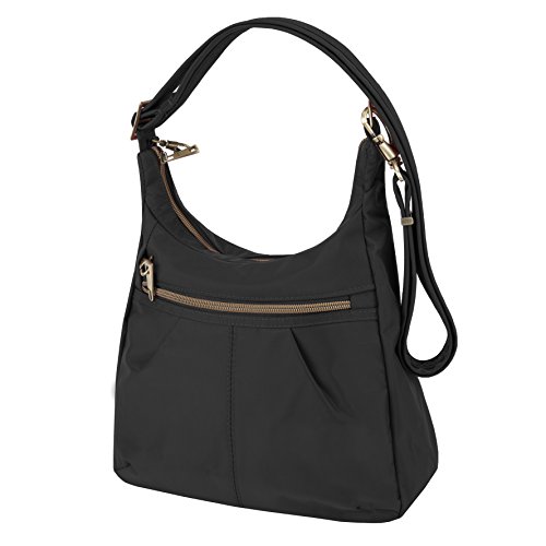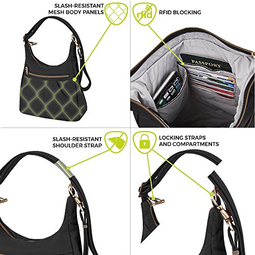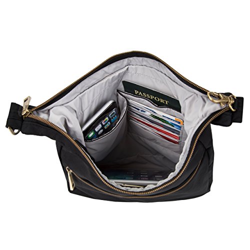 Studio : Travelon Publisher : Travelon Binding : Apparel Product Description Locking main compartment with RFID blocking card and passport slots Slash-proof construction Adjustable, cut-proof shoulder strap attaches to post or chair Locking front zip pocket Rear zip pocket 0