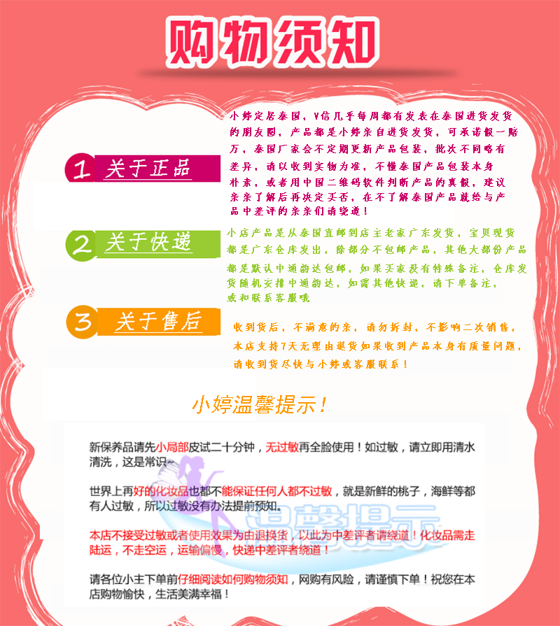 小店所有产品都是小婷亲自从泰国曼谷大量直邮并囤货在老家广东仓库,淘宝现货都是广东仓库发出哦,小婷代购泰妆已有接近5年时间,产品在国内均有大量囤货,只做正品,只做良心买卖,如有其它疑问,可加店主V信号nui900或者15976378406!