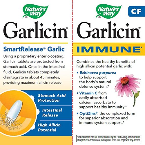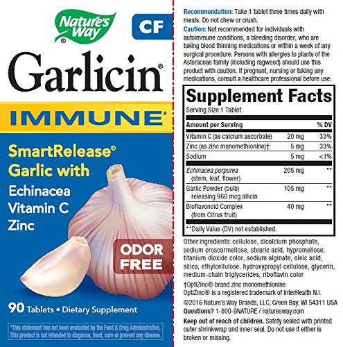 -. Binding : Health and Beauty -. Brand : Nature's Way -. Department : Health and Beauty>Health and Wellness -. EAN : 0033674067956 -. Feature : Nature's Way -. IsAdultProduct : 0 -. IsAutographed : 0 -. IsMemorabilia : 0 -. Label : Nature's Way -. LegalDisclaimer : * These statements have not been evaluated by the Food and Drug Administration. This product is not intended to diagnose, treat, cure or prevent any disease. ** Always refer to the manufacturer's label on the product for description, recommended dose and precautions. -. Manufacturer : Nature's Way -. Model : 6795 -. MPN : 6795 -. NumberOfItems : 1 -. PackageQuantity : 1 -. PartNumber : 6795 -. ProductGroup : Health and Beauty -. ProductTypeName : HEALTH_PERSONAL_CARE -. Publisher : Nature's Way -. ReleaseDate : 2010-05-13 -. Size : 90 -. Studio : Nature's Way -. Title : Nature's Way Garlicin CF, 90 Tablets -. UPC : 033674067956