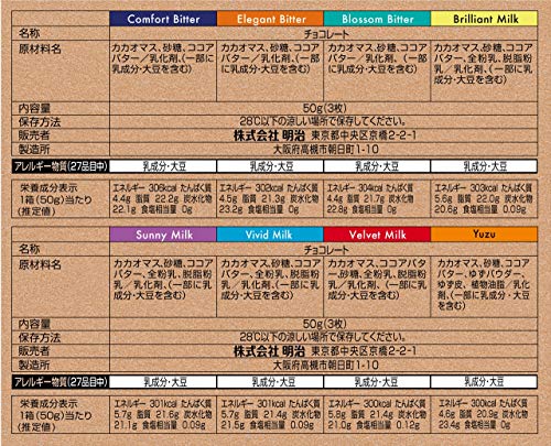 原材料:<明治ザ・チョコレート華やかな果実味エレガントビター> カカオマス、砂糖、ココアバター、乳化剤、(一部に乳成分・大豆を含む) <明治ザ・チョコレート軽やかな熟成感ビビッドミルク> カカオマス、砂糖、ココアバター、全粉乳、脱脂粉乳、乳化剤、(一部に乳成分・大豆を含む) <明治ザ・チョコレート凛と香り立つブロッサムビター> カカオマス、砂糖、ココアバター、乳化剤、(一部に乳成分・大豆を含む) <明治ザ・チョコレート可憐に香るブリリアントミルク> カカオマス、砂糖、ココアバター、全粉乳、脱脂粉乳、乳化剤、(一部に乳成分・大豆を含む) <明治ザ・チョコレート優しく香るサニーミルク> カカオマス、砂糖、ココアバター、全粉乳、脱脂粉乳、乳化剤、(一部に乳成分・大豆を含む) <明治ザ・チョコレート力強い深みコンフォートビター> カカオマス、砂糖、ココアバター、乳化剤、(一部に乳成分・大豆を含む) <明治ザ・チョコレート濃密な深みと旨味ベルベットミルク> カカオマス、ココアバター、砂糖、全粉乳、脱脂粉乳、乳化剤、(一部に乳成分・大豆を含む) <明治ザ・チョコレートゆず> カカオマス、砂糖、ココアバター、ゆずパウダー、ゆず皮、植物油脂、乳化剤、(一部に乳成分・大豆を含む)