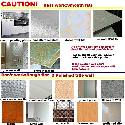 - MULTIPURPOSE SUCTION CUP ACCESSORY: Ideal for any smooth surface without any concave-convex,such as:glossy ceramic tiles,glass,Stainless Steel,decorative metal surface,refrigerator,washing machine.However,NOT EFFICIENT ON POROUS SURFACES, as suction capacity of our hooks is restricted on painted walls and bumpy wood, porcelain or wallpaper surfaces.