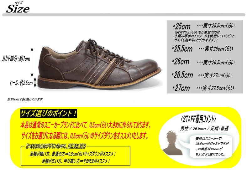 | サイズ | 作り⇒少し大きめ 【サイズ選びのポイント!】 足幅が細い方、普通の方⇒0.5cmくらいサイズダウンがオススメ! 足幅が広い方、甲が高い方⇒そのままがオススメ! ▼ご確認下さい!▼ 本品は通常のスニーカーブランドに比べて,0.5cmくらい大きめに作られております。サイズをお選びになる際には,0.5cmくらいのサイズダウンをオススメいたします。 |