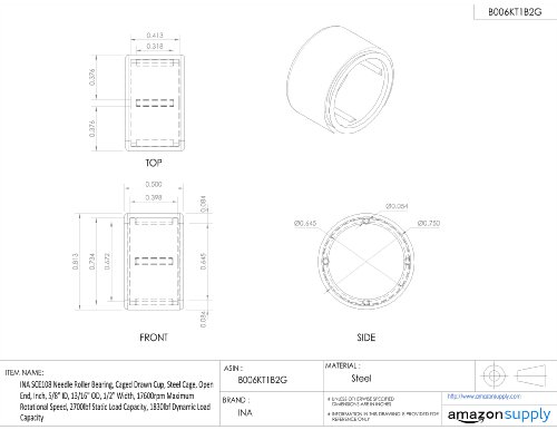 INA SCE108 Needle Roller Bearing, Caged Drawn Cup, Steel Cage, Open End, Inch, 5/8" ID, 13/16" OD, 1/2" Width, 17600rpm Maximum Rotational Speed, 2700lbf Static Load Capacity, 1830lbf Dynamic Load Capacity
