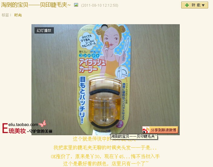 无意中翻到了博客网友有专门推荐这款睫毛夹,给大家参考一下(复制到IE栏回车即可打开http://blog.sina.com.cn/s/blog_6991c49b0100sh2a.html)