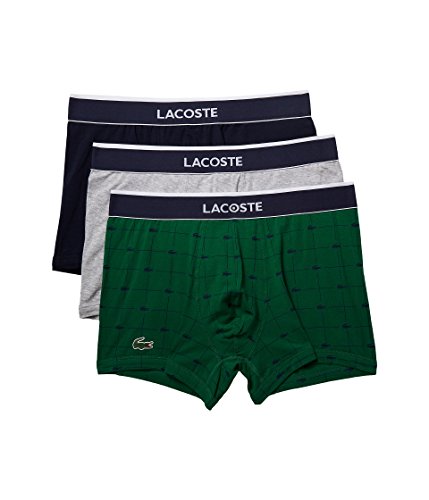 Lacoste Men's 3 Pack Signature Print Cotton Stretch Trunk, Nvy/Grn Crc/Gry, LARGE