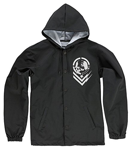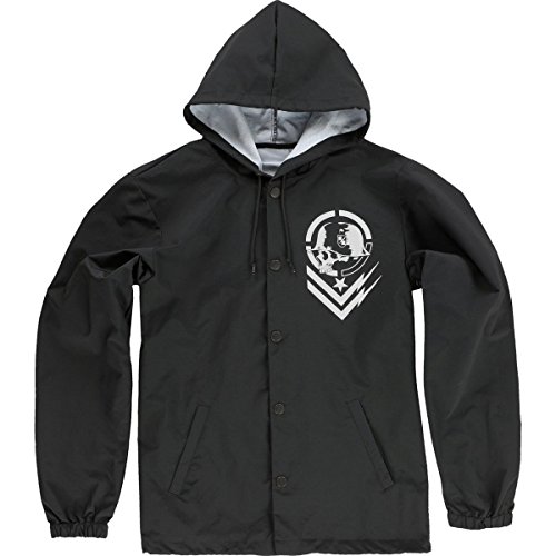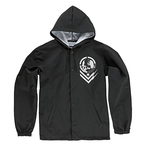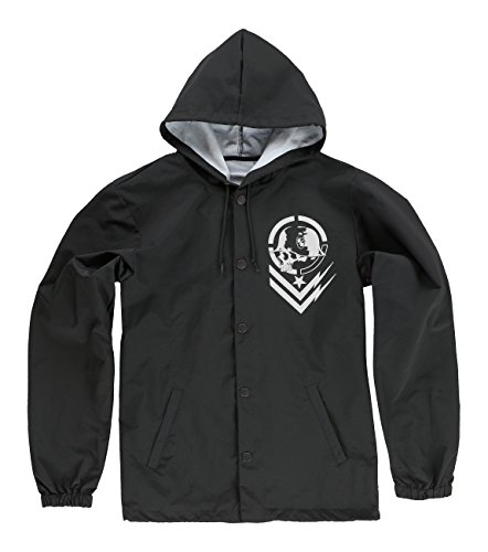 Studio : Metal Mulisha Young Men's Publisher : Metal Mulisha Young Men's Binding : Apparel Product Description Coaches jacket with hood, one color screen print at chest, black metal trims and draw cord at inside waistband. Woven label at front right hem 0