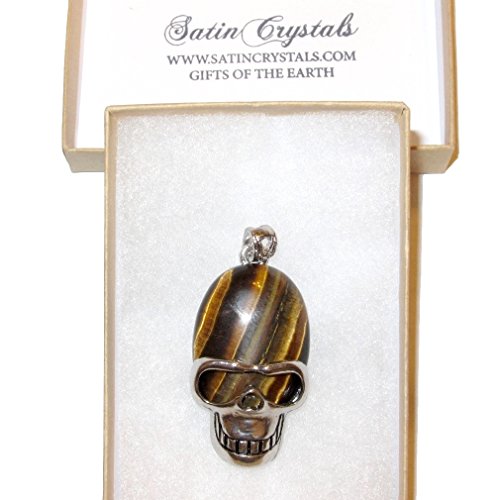 Your beautiful skull pendant is made from attractive tiger's eye gemstone, with chatoyant brown and gold patterns. The pendant has an oval stone with a friendly skeleton silver metal alloy frame and bail. You receive one per order from a limited hand select Satin Crystals collection.