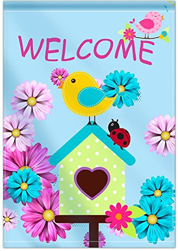 Olive Green Welcome Garden Flag Birds Flowers and Ladybugs| Double-sided, Polyester, Great Design Yard Flag to Brighten Up Your Home
