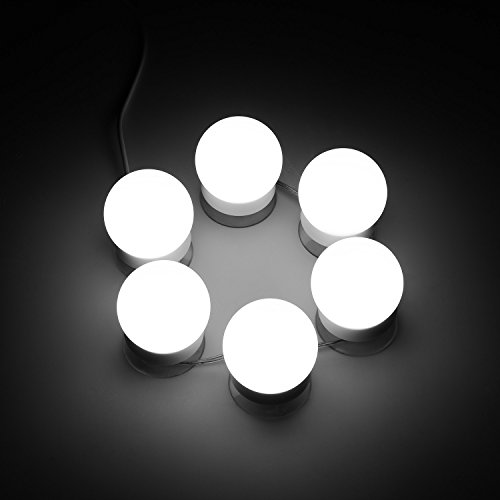Description: This Hollywood style vanity light kit features 6 LED bulbs, which produce bright white lights and a soft glow through the frosted globes to illuminate your entire face, no matter how dim the environment.