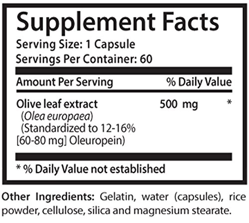 -. Feature : OLIVE LEAF EXTRACT: Olive Leaf extract is extracted from the leaves of the olive plant. The active ingredient found in olive leaves is called oleuropein. The nutrient was found to contribute to the many health benefits including anti-inflammatory properties and antioxidant effects. / ENERGY BOOST: When taking olive oil extract, an increased amount of energy is one of the most common benefits. Olive oil extract is often used by those experiencing fatigue, but who have no desire to change their diet or exercise routine. However, regular exercise while taking this supplement may amplify benefits. When taking olive leaf extract while fatigued it may cause you to regain energy. / CARDIOVASCULAR HEALTH: Researchers believe olive leaf extract can have positive effects blood pressure. One study assessed the effects of olive leaf extract on cholesterol levels. Subjects who took the extract for eight weeks had significantly decreased cholesterol levels. Studies demonstrate that olive leaf extracts lead to calming effects in elevated blood pressure. / ANTI-AGING EFFECTS: Since oleuropein is found to have anti-oxidative properties, it helps support cells from aging wear and tear. You may want to consider using olive leaf extract to help stop skin damage from sun exposure. In lab studies and tests oleuropein extract of olive leaf reduced reddening of the skin, dehydration and blood flow to the skin better than vitamin E. / GUARANTEED 100% SATISFACTION! MADE IN U.S.A. No Additives or Fillers, Zero Artificial Ingredients. In addition, our formula is made in FDA approved facility under GMP standards.