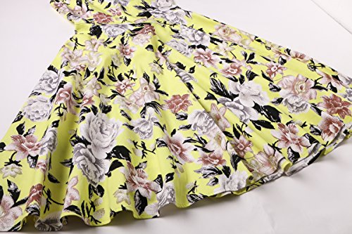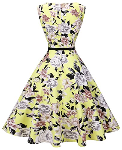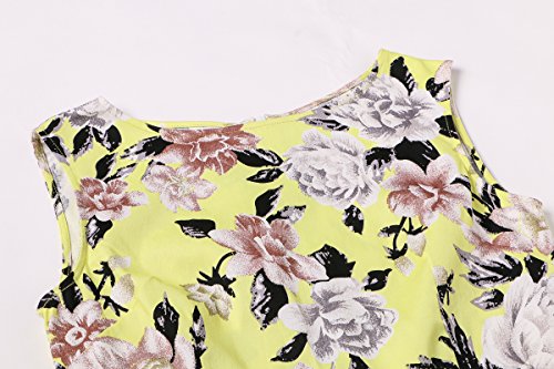 VOGVOG Women Boatneck Sleeveless Vintage Tea Cocktail Dress with Belt, Floral Yellow, Small