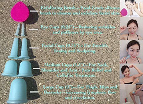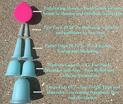 Cupping Therapy Relieve pain, stress, and inflammation with a detoxifying cupping set that helps restore your mobility with a deep tissue massage that improves circulation. Modern Cupping With Ancient Wisdom - Cupping is an ancient Chinese method of massage for comfort. Cupping Therapy, the technique is beneficial and exceptionally safe and can be quickly learned and introduced into your health practices. The new cups have done away with the traditional firing. It has made the application of the cups easy and safe. It has not only enhanced adequacy but also simplified the procedures of cupping therapy. They are easier to be handled and more secure to be utilized for a massage at home. In China, the new containers are exceptionally popular for family cupping massage. Does cupping hurt? The experience is not billed as a relaxing one - "It's not like a massage, so you're not going to be very relaxed, it's not going to be therapeutic in that way, this is a treatment." Cupping Therapy Activate Lymphatic Systems Regular usage, a professional cupping system can help improve your circulation which impacts lymphatic systems throughout your body. These can include muscle, joint, neck, and lower back areas; as well as sectors that cause headaches or migraines. Cupping Therapy Increase Circulation and Energy By improving your natural circulation and detoxifying the body, you can improve your mobility by reducing injury or stress recovery times. It can also help impact your mood and ability to get deeper, more enjoyable sleep. Order Includes: Large Cup (2") Two (2) Small Cups (1.5") Two (2) Facial Cups (0.75") Two (2) Eye Cups (0.25") Silicone Exfoliating Facial Brush Complete Guide
