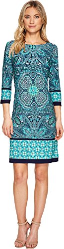 London Times Women's Medallion Printed 3/4 Sleeve Jersey Shift Dress, Teal, 16