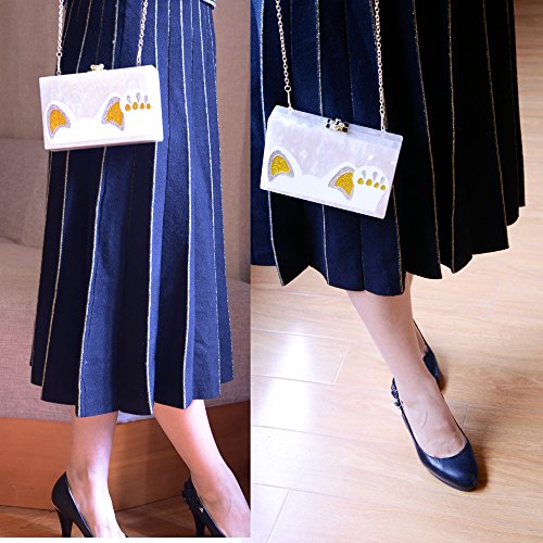 -. Feature : Acrylic Material:This bag is made of high quality and special acrylic material which makes it has smooth and stylish surface. Cute Cat shape makes this bag is unique that you can catch one's eye at the first time / Large Capacity: The main compartment fit up 7 Plus well, mirror, a folding hair brush, small bottle of perfume, lipstick, jewelry. / Dimensions : 7.1 in (L) X 1.8 in (W) X 4.3 in (H) / Be Elegant in Any Occasion:Elegant design for weekend,wedding,evening party, prom,cocktail various parties,night out or formal occasions / Multifunction:Easy to carry and adjust that it can be used as cross-body bag,evening clutch,shoulder bag,acrylic purse,women handbag,and the chain is detachable you can take it in hand in or on the shoulder