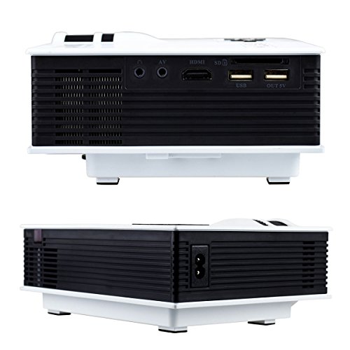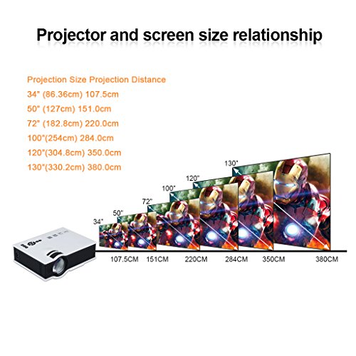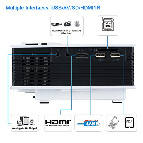 - Feature : Native Resolution:800*480;Brightness:800 Lumens;Contrast:800:1;Aspect Ratio: 4:3/16:9 / Image size:30-120 Inches, Projection distance:3.5-12.5 feet. With keystone correction, adjusting the picture trapezoidal distortion / Multi-function input VGA/AV/USB/SD/HDMI/Micro USB, 50W low power cost / LED lamp, 20,000 hours life. Portable design, easy to take and travel. Great for outdoor movies / Not recommended for PPT or business presentation, ideal for home theater movies and video game use