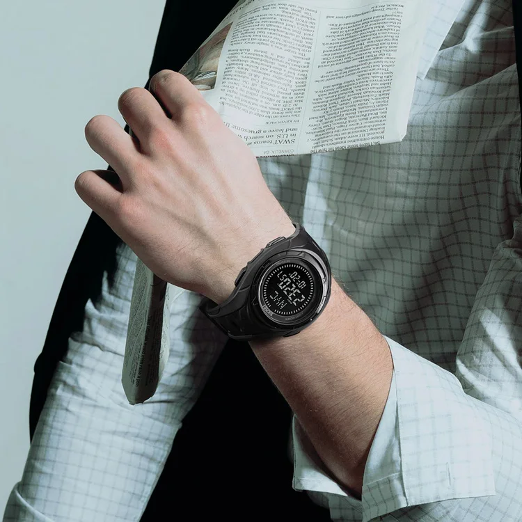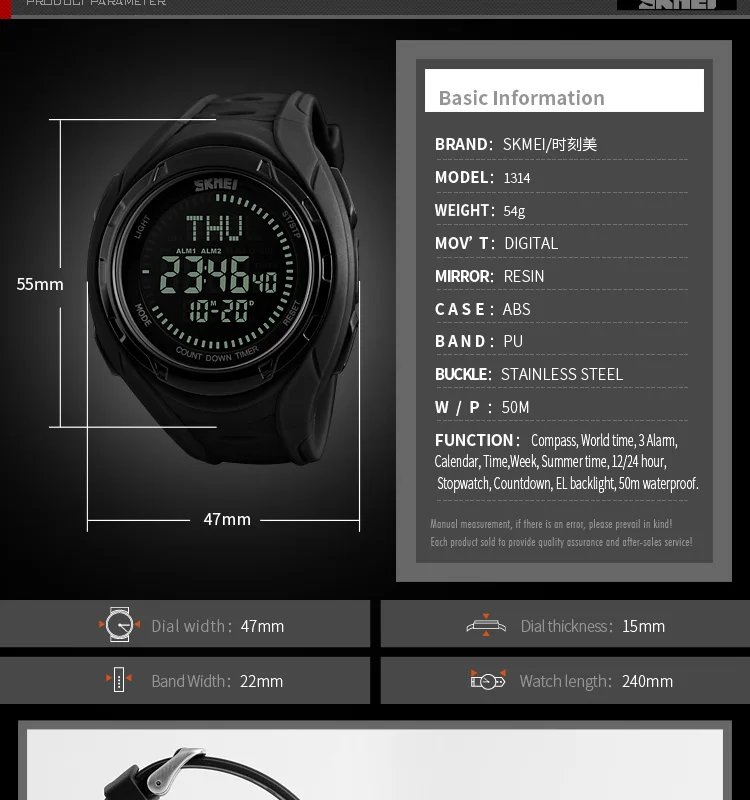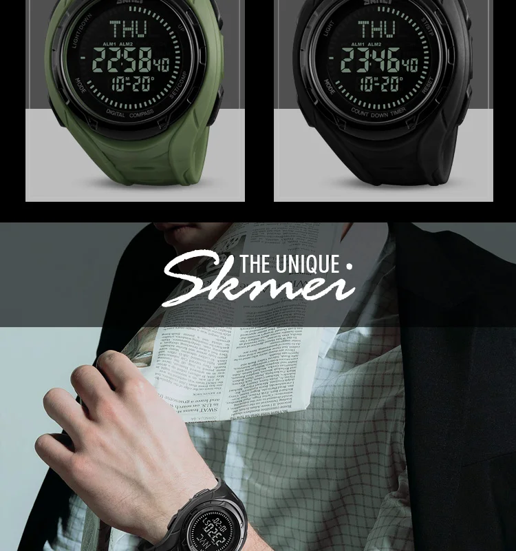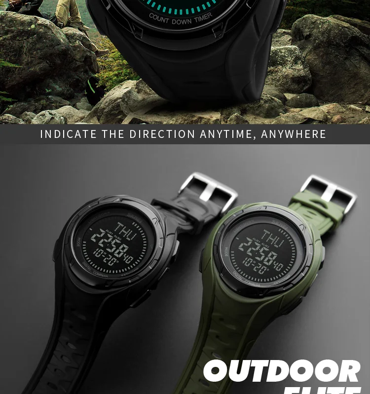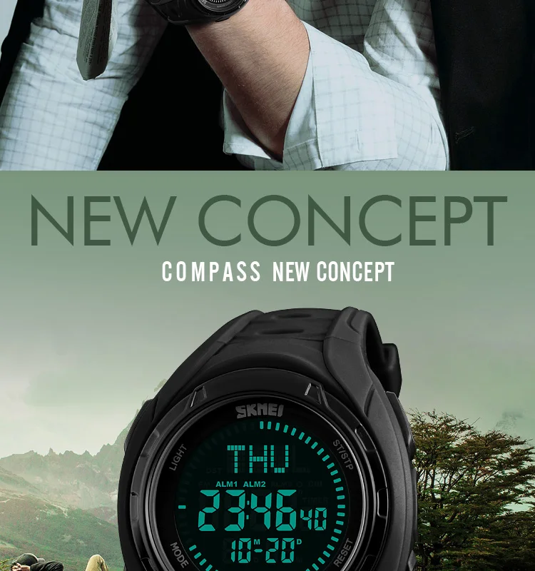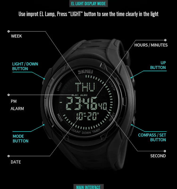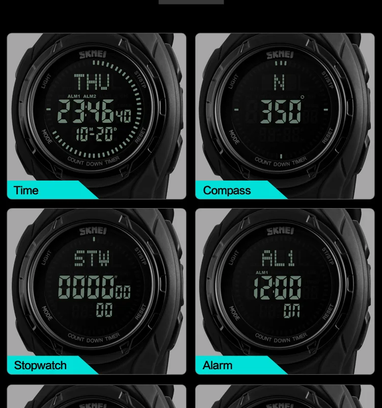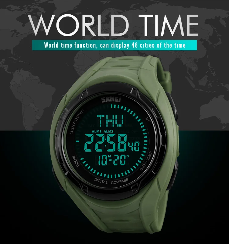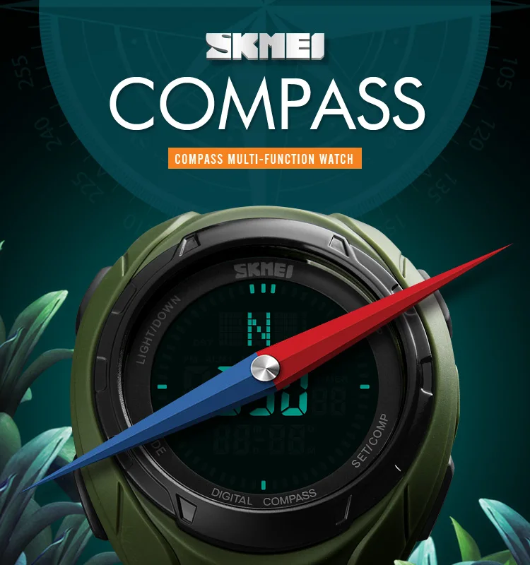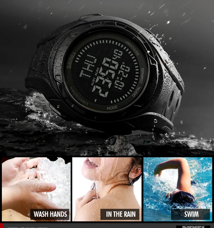 Feature:Back Light,Alarm,Water Resistant,Shock Resistant,Stop Watch,Swim,Week Display,Auto Date,Compass
