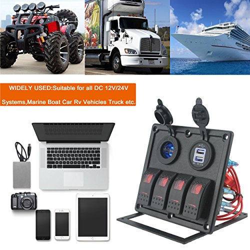 Waterproof 4 Gang LED blue Marine Boat Rocker Switch Panel with 12V voltmeter and Power socket