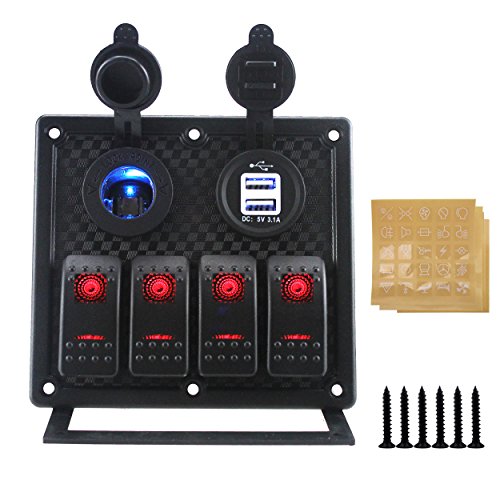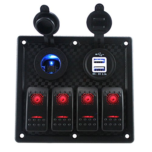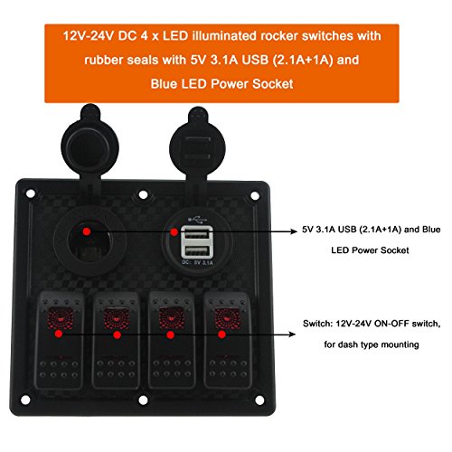 12V-24V DC 4 x LED illuminated rocker switches with rubber seals with 5V 3.1A USB (2.1A+1A) and Blue LED Power Socket