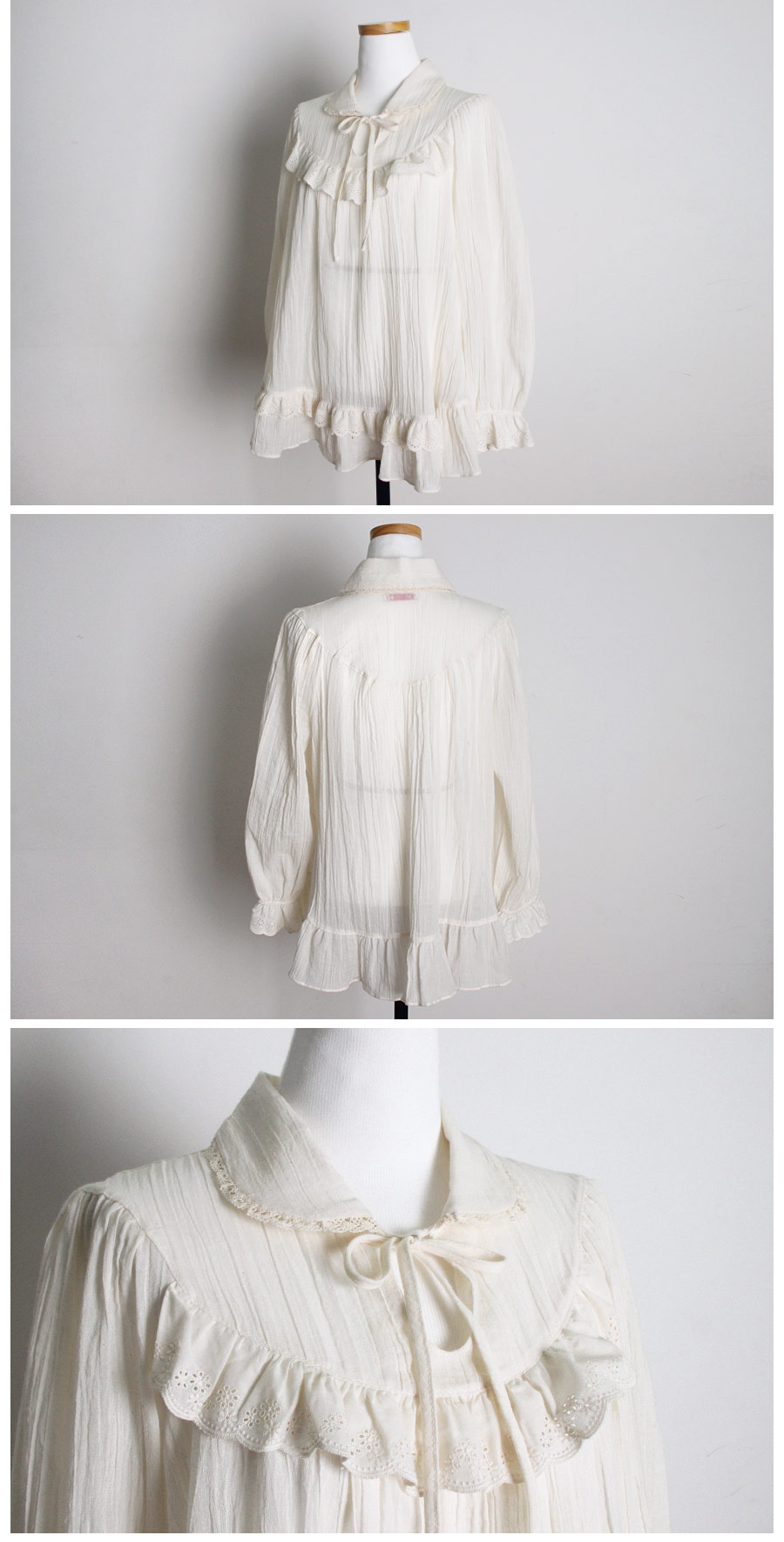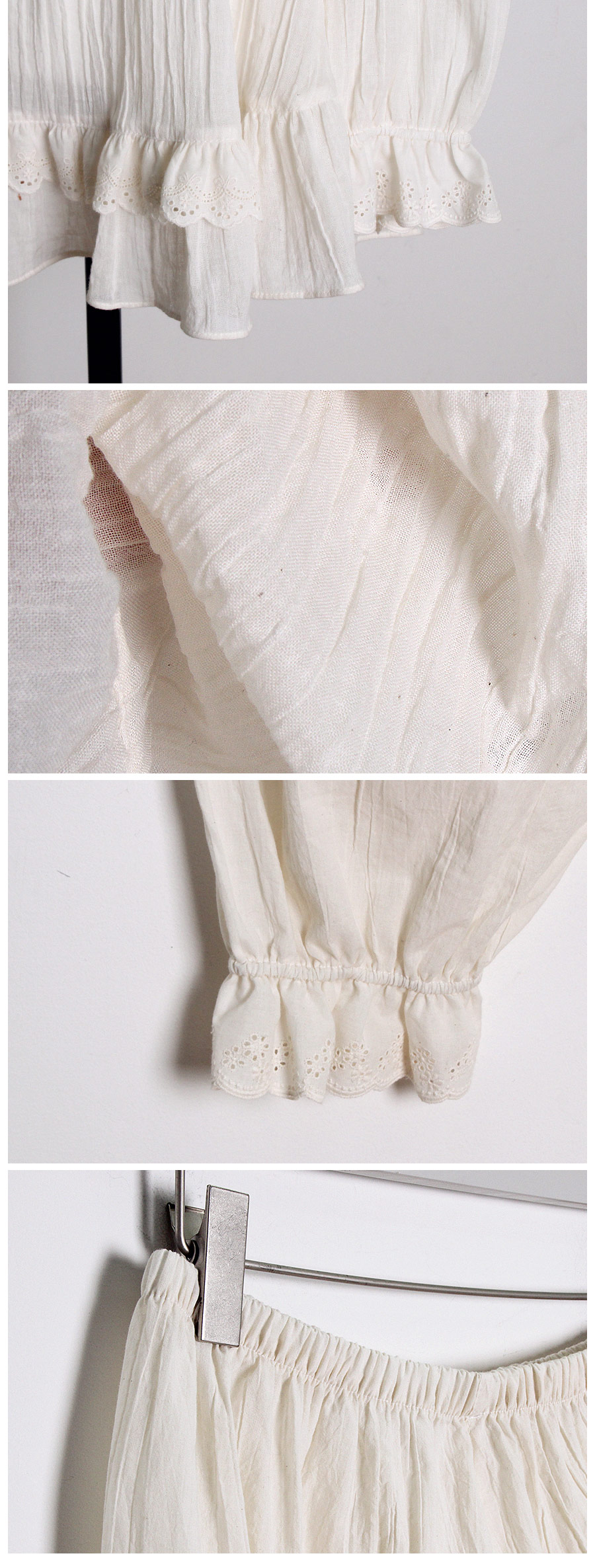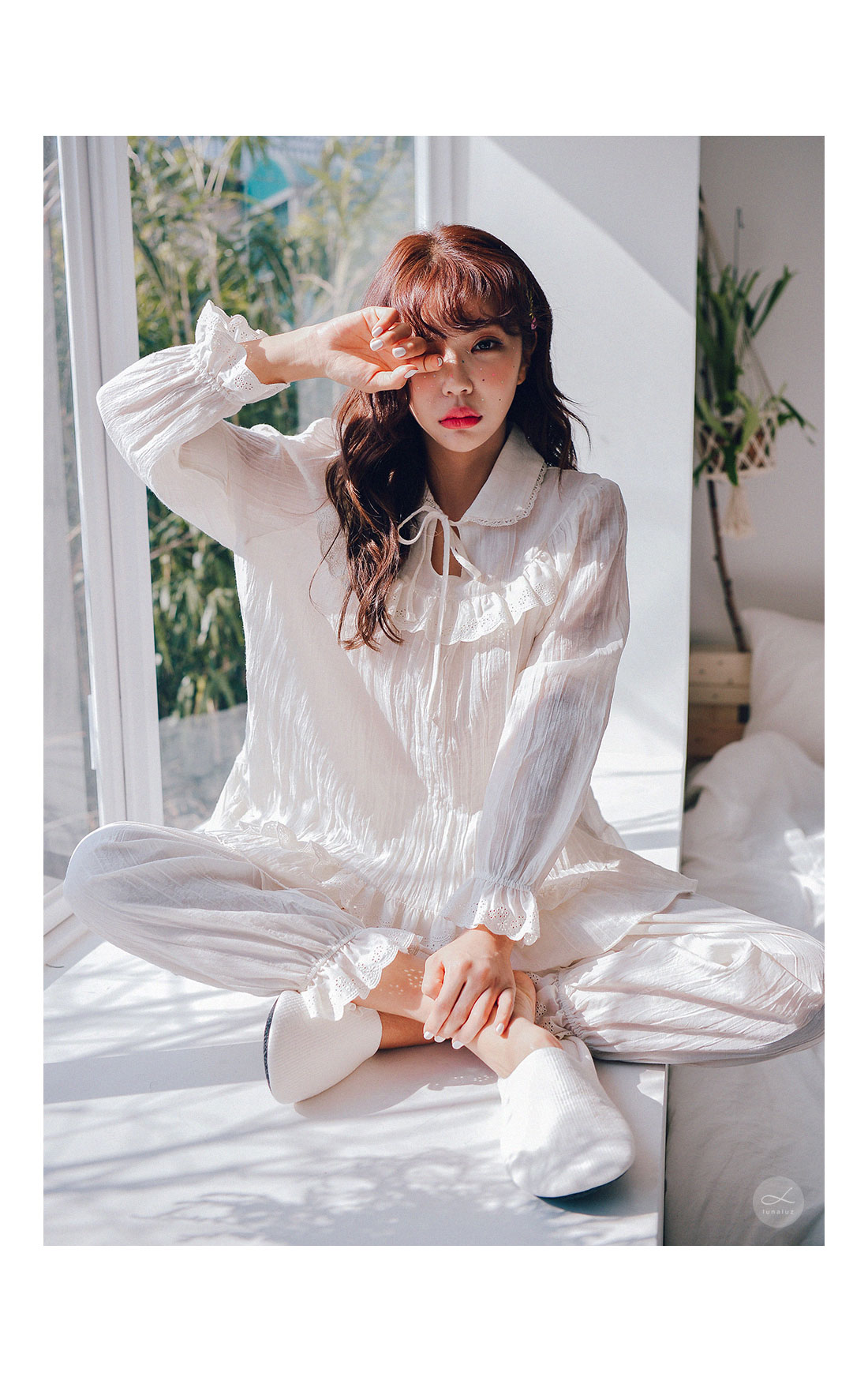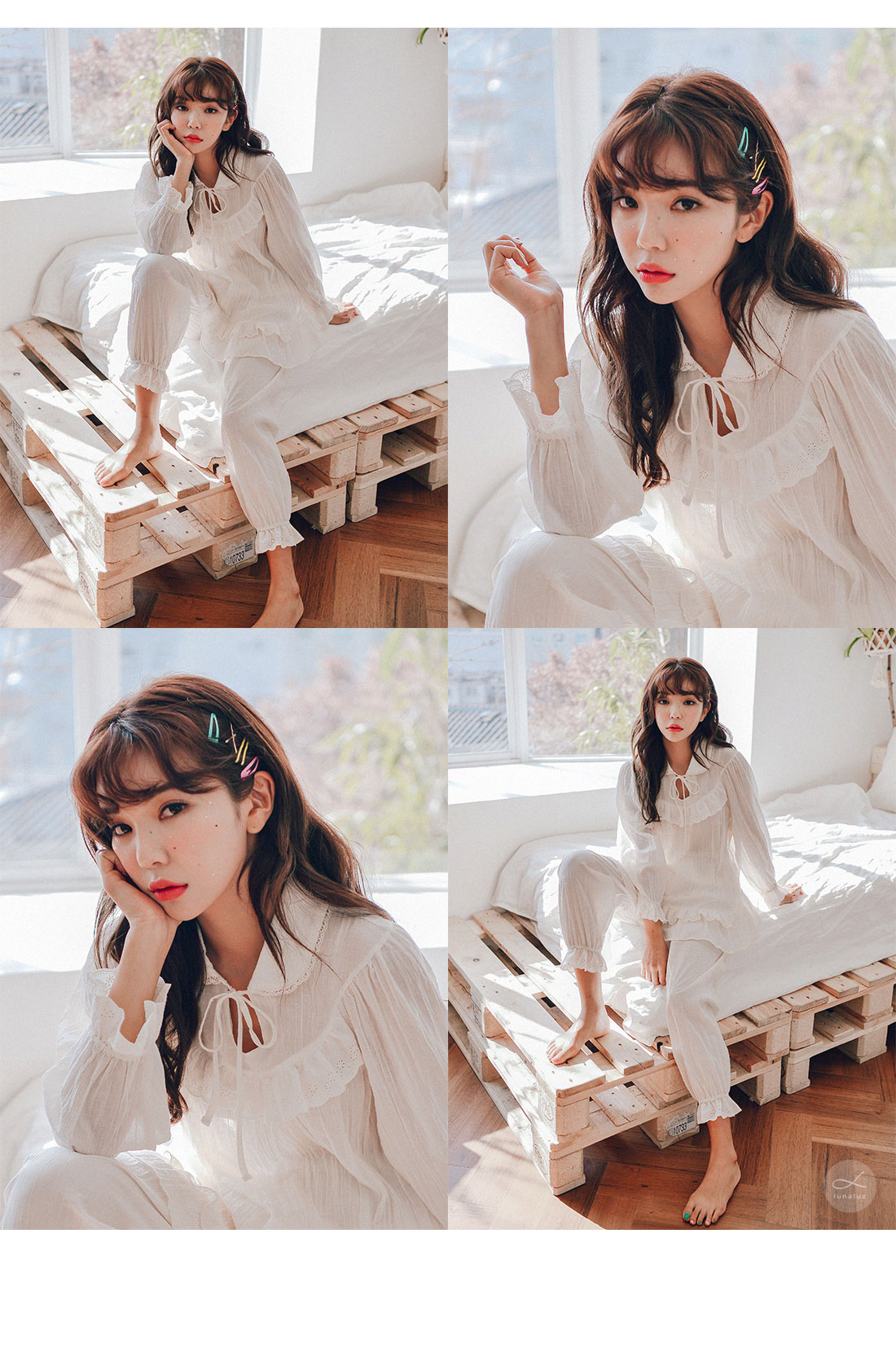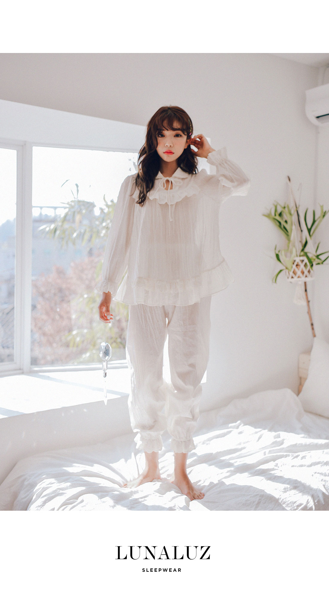 불규칙한 구김선이 은은하고 고급스러운 분위기를 연출해주는 크리즈 소재의 60수 면 잠옷입니다. 봄 여름에 강력 추천해드리고 싶은 소재로 피부에 들러붙지 않는 네츄럴한 실루엣을 만들어주며 시원하고 가볍습니다. 크리즈 가공 소재로 세탁, 관리하기 용이하고 여름에 착용하기 좋은 통풍이 우수한 소재입니다. 자연적이고 네츄럴한 스타일을 좋아하는 고객님들께 특히 추천해드리고 싶은 잠옷입니다, 은은한 연베이지 컬러감이 고급스러움을 더해줍니다. 크리즈가 잡혀져 있는 원단인 많큼 많은 요척을 사용한 잠옷으로 소재에서부터 충분한 매력을 느끼실 거에요! DETAIL 카라 스타일의 잠옷으로 양 사이드에 길 재끈으로 리본을 매듭지어 연출할 수 있는 잠옷이에요. 카라의 끝 부분에 동일한 컬러로 레이스를 염색시켜 봉제했습니다. 바스트 라인을 따라 동일한 컬러의 면 레이스를 염색시켜 봉제 했는데요. 페미닌한 블라우스 느낌이 감도는 잠옷으로 굉장히 고급스러워요! 뒤에서 보았을 때도 실루엣이 매력적입니다. 우아하고 팬시한 잠옷으로 적극추천해 드립니다. 100% 국내 생산으로 봉제선이 깔끔하고, 디자인과 부자재, 소재의 퀄리티가 높습니다. SIZE 44반~66size까지 커버 가능한 free 사이즈입니다.