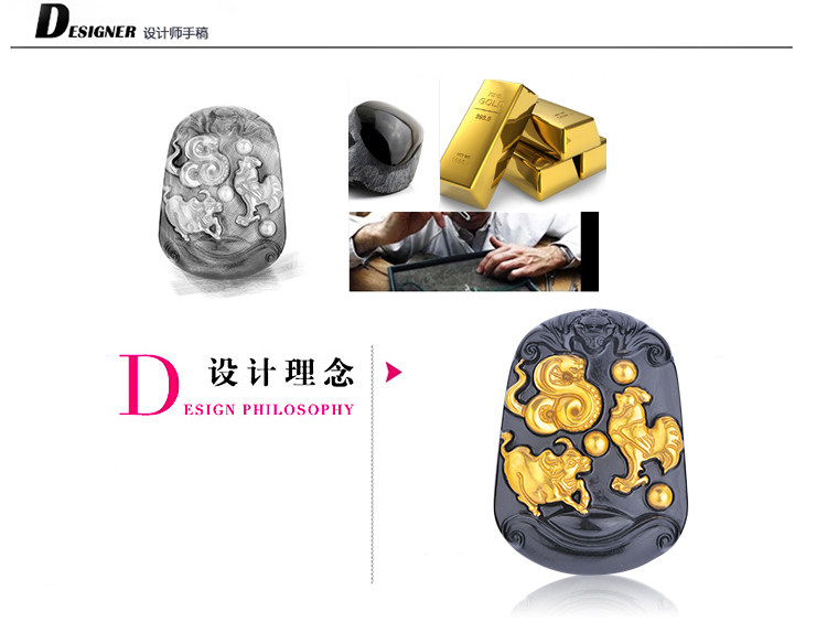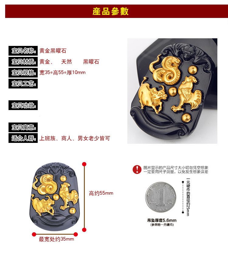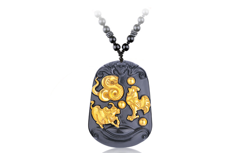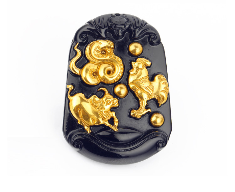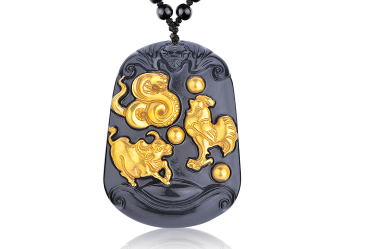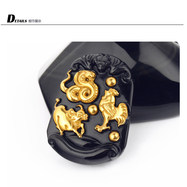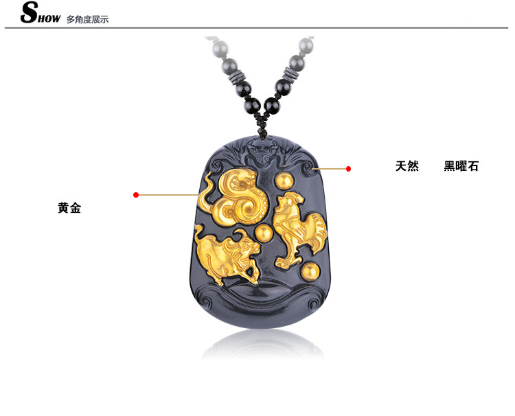 开光黄金版黑曜石三合贵人 生肖属蛇鸡牛终生吉祥物吊坠