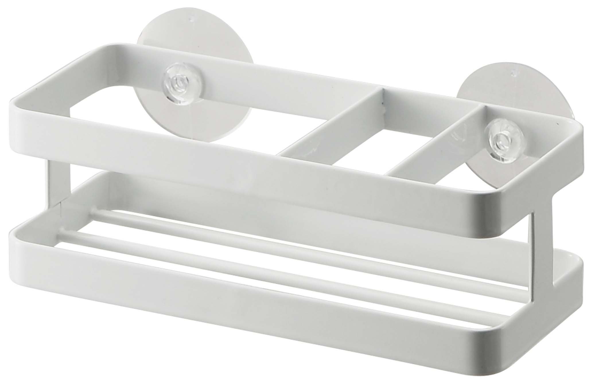 Two sponges that are troubled at the place and a dishwasher dispenser are stored all together.