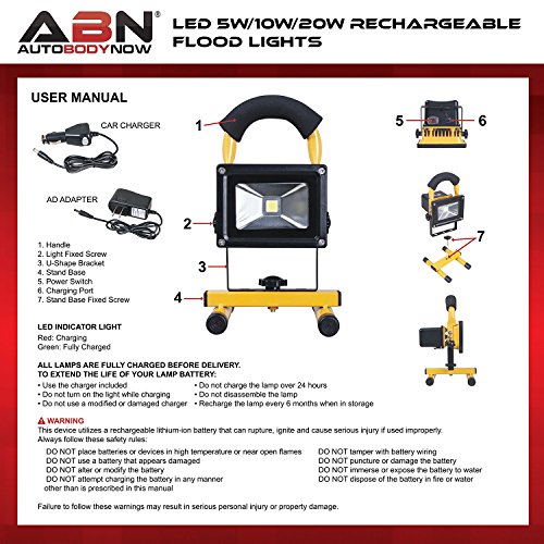 Practical: Use the ABN LED Flood Light 20 Watts 1,800 Lumens 12V Indoor/Outdoor IP 65 Waterproof Rechargeable Portable Job Site Work Light to effectively light the scene of an accident, work in the garage, or sit at a campsite