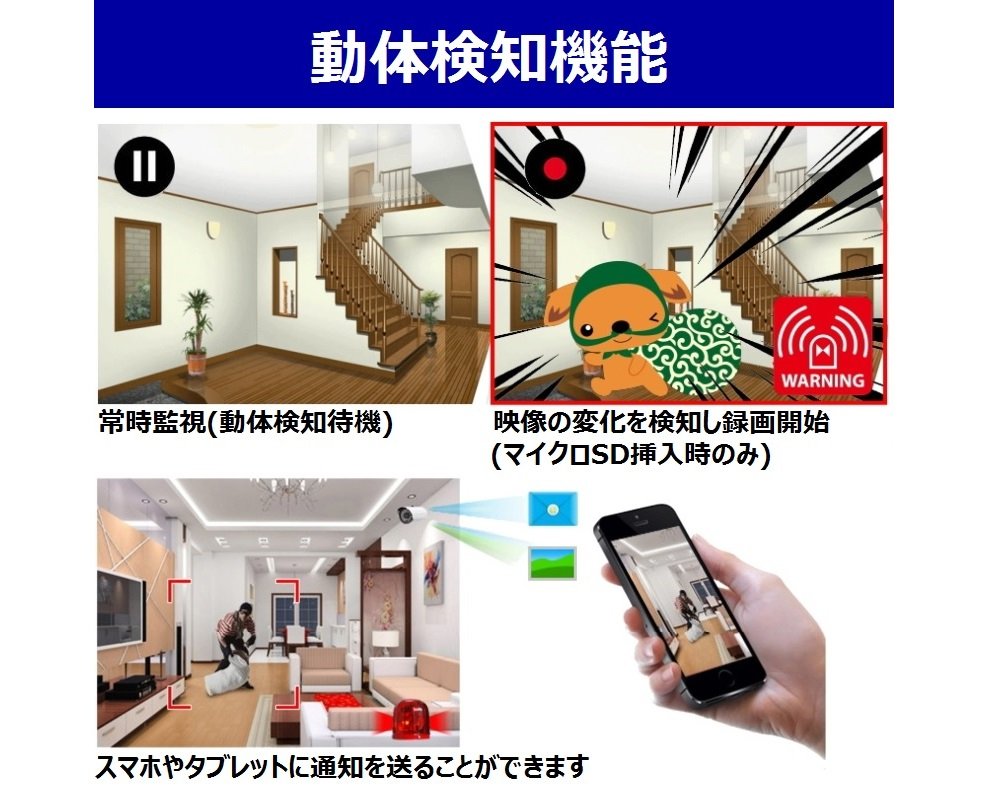 ● When a motion detection alarm occurs, you can automatically start recording the camera body, sound the buzzer of the camera body, or send a notification to the smartphone / tablet.