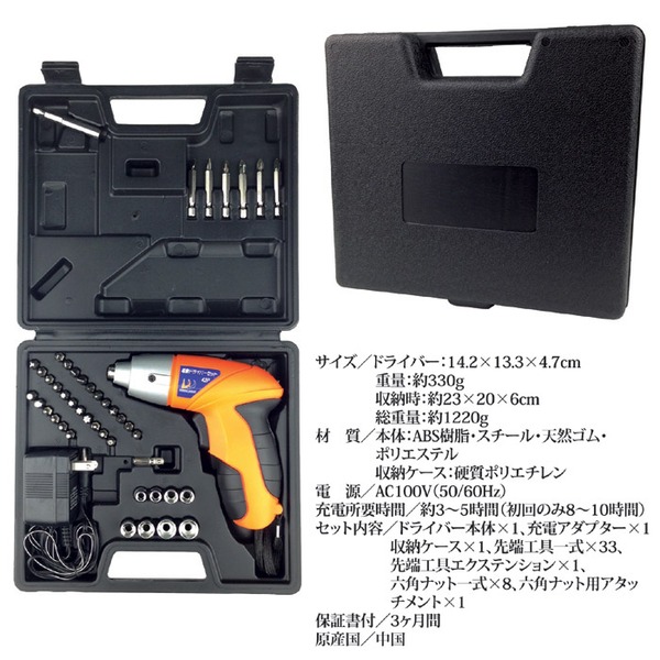 ドライバー本体×1、充電アダプター×1、収納ケース×1、先端工具一式×33、先端工具エクステンション×1、六角ナット一式×8、六角ナット用アタッチメント×1