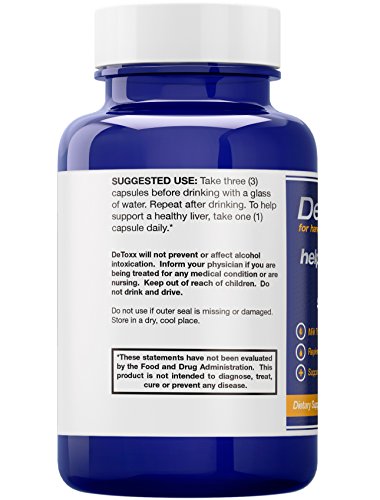 DeToxx will not prevent or affect alcohol intoxication. Inform your physician if you are being treated for any medical condition or are nursing. Keep out of reach of children. Do not drink and drive.
