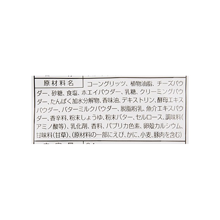 원재료:콘《구릿츠》,식물성 기름지,치즈 파우더,설탕,식염,《호에이파우다》,유당,크리밍 파우더,담백 가수분해물,향기 맛유,덱스트린,효모 엑기스 파우더,버터 밀크 파우더,탈지분유,생선 및 조개류 엑기스 파우더,향신료,분말 간장,분말 버터,셀룰로오스,조미료(아미노산등)고, 유화 제,향료,파프리카 색소,난각 칼슘,감미료(감풀)고,(원재료의 일부에 새우,인지(든가)에,밀,돼지고기를 포함한다)
